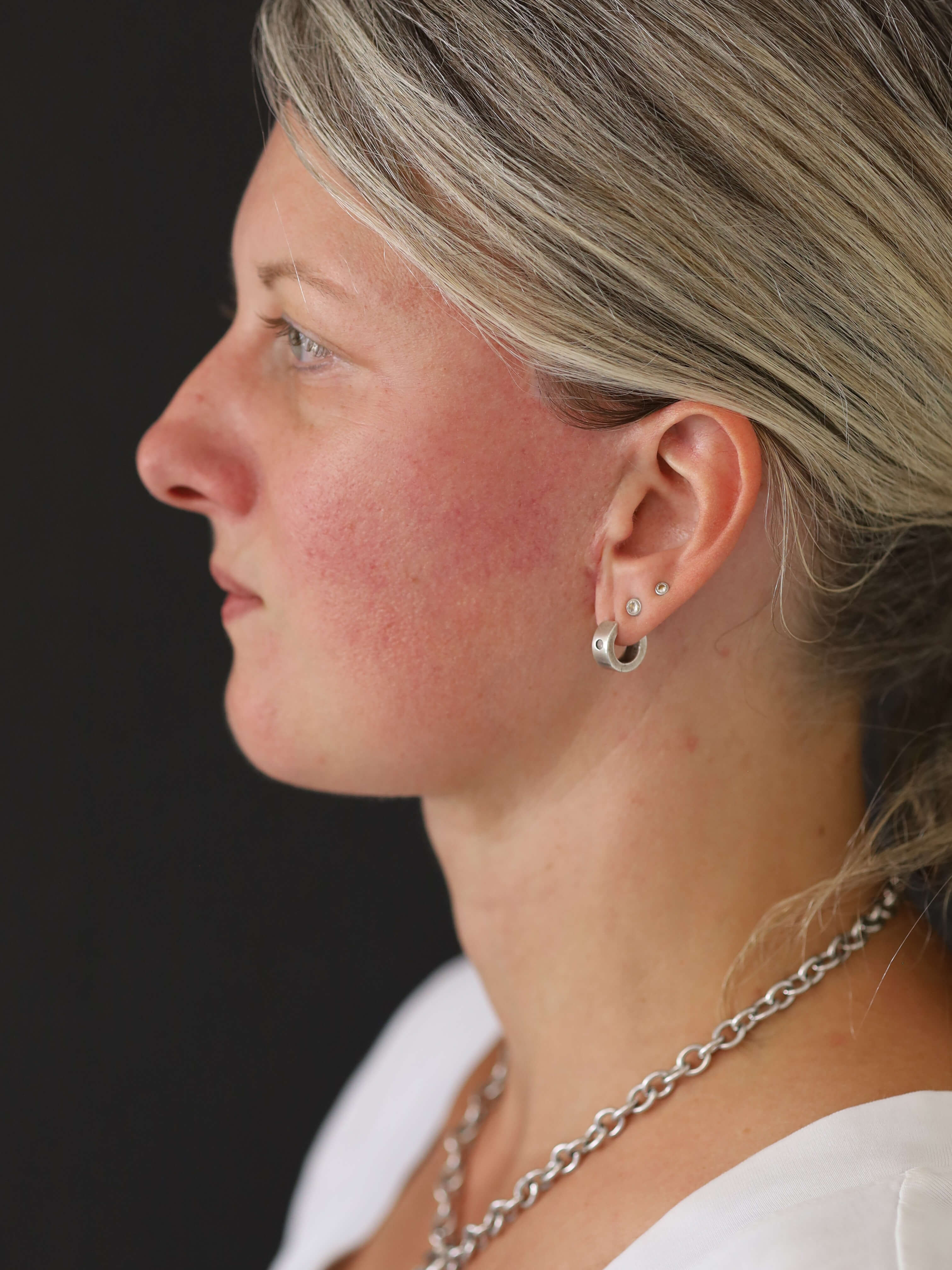 One of the deeper layers of the face is the SMAS (Superficial Muscular Aponeurotic System). While the lateral (side) parts of the face remain relatively fixed during the ageing process (“fixed SMAS”), the medial (middle) parts (“mobile SMAS”) continuously decrease with increasing age: this results in so-called sagging cheeks, which slide over the jaw and chin line to the neck area. The volume of the cheeks decreases and moves slightly forward towards the mouth. This results in a significant deepening of the laugh lines (nasolabial folds) not only when facial expressions are made, but also at rest. This can create a so-called “negative vector” in the corners of the mouth, i.e. the corners of the mouth tend to point downwards in the resting position, which can unintentionally lead to a rather unflattering sad and sometimes even grumpy facial expression. With a deep plane facelift, the age-related volume shifts in the face are largely reversed and the overlying skin tissue is loosely fitted in front of the ear without tension. With the deep plane facelift technique, the wrinkles on the neck are usually significantly improved by an accompanying neck lift.