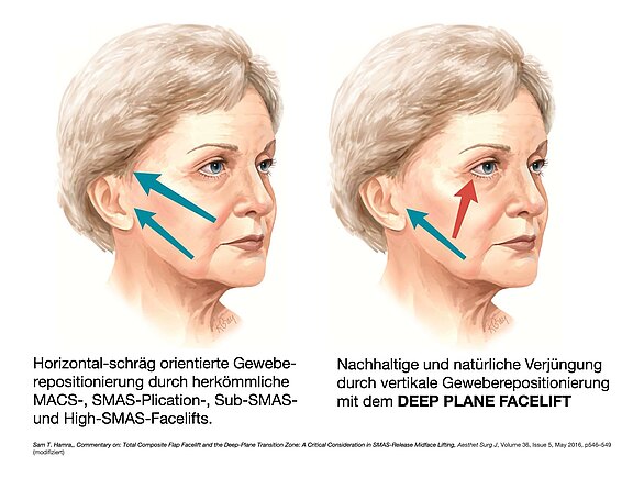 In contrast to other facelift methods, the neck region can be tightened significantly better with the extended deep plane facelift (DPFL) by consistently mobilizing the neck tissue. Natural-looking facelift results can be achieved with the DPFL. The effects of the facelift are long-lasting, patients still look much younger 10-15 years after the facelift as if they had not had it performed. Of course, a secondary DPFL can also be performed many years later.
